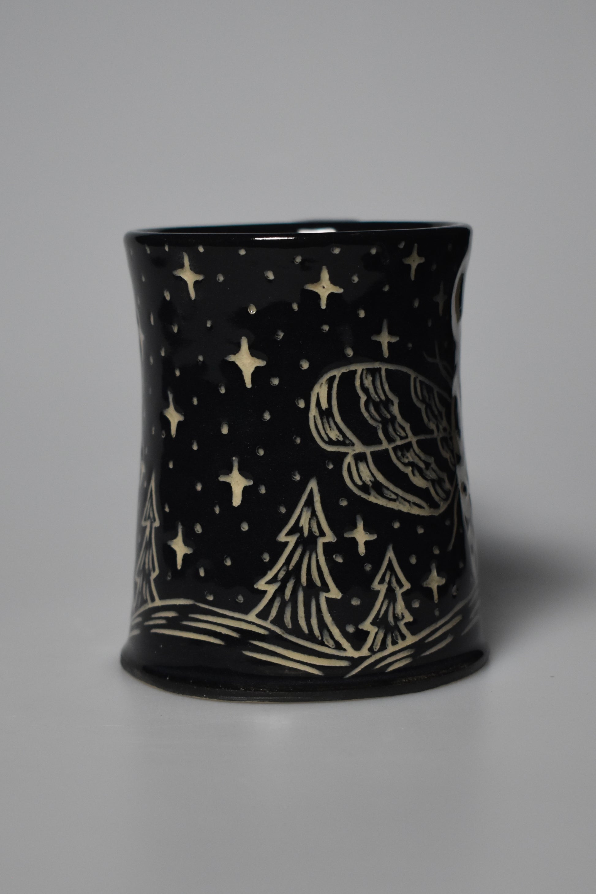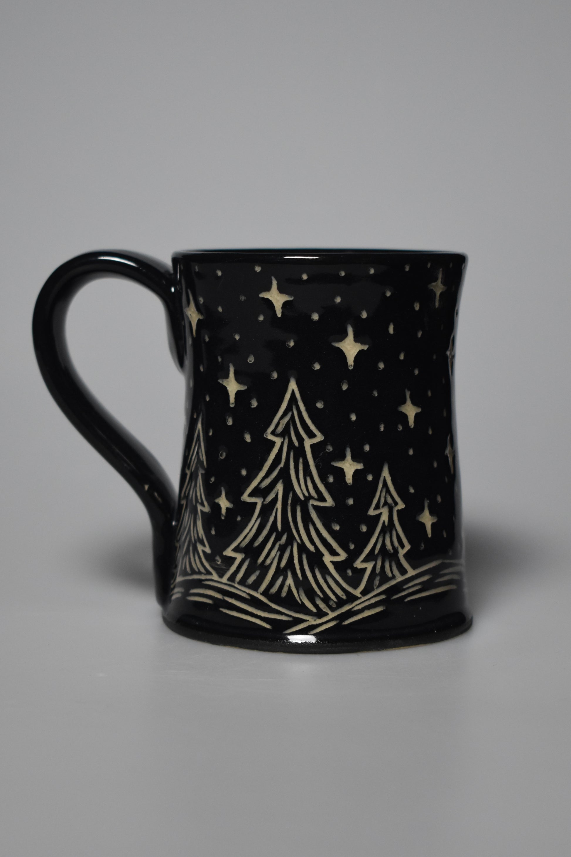 This mug was hand turned on the wheel then hand-carved using the “Sgrafitto” technique. Every piece is unique in its own way, even if a design is replicated. All of my pottery is microwave, dishwasher, and food safe.