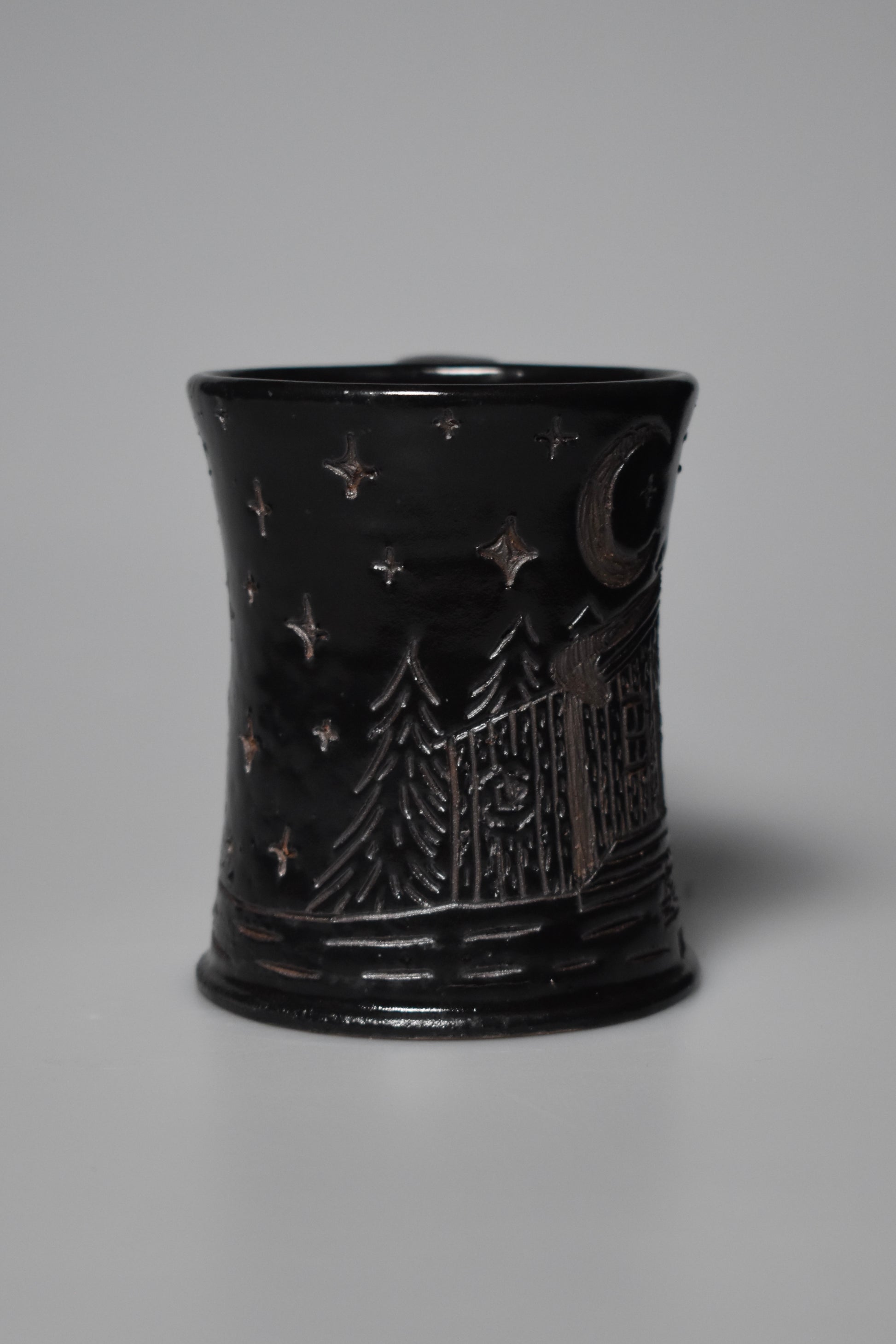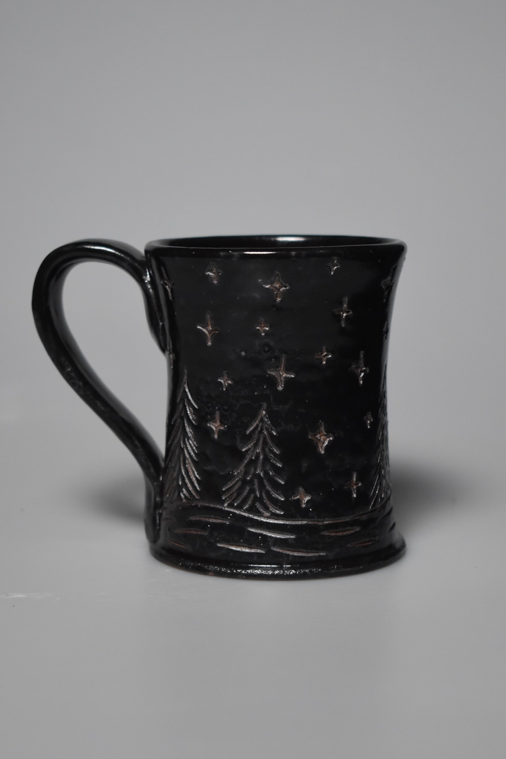 This mug was hand turned on the wheel using a wild clay blend with clay from our property. It is then hand-carved using the “Sgrafitto” technique. Every piece is unique in its own way, even if a design is replicated. All of my pottery is microwave, dishwasher, and food safe.